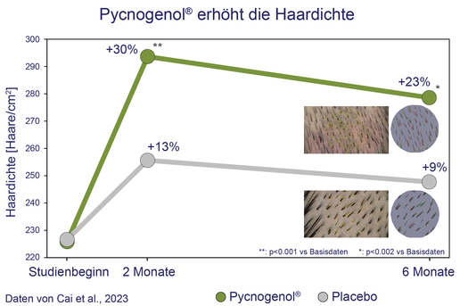 Eine placebokontrollierte, doppelblinde und randomisierte Studie1 aus dem Jahr 2023 mit Frauen in den Wechseljahren zeigte, dass die Einnahme von Pycnogenol® zu einer Erhöhung der Haardichte, Verbesserung der Mikrozirkulation der Kopfhaut sowie Verringerung des transepidermalen Wasserverlustes führte. 33 Frauen nahmen über sechs Monate täglich 150 mg Pycnogenol® ein, während 30 Frauen das Placebo verabreicht bekamen. Die Haardichte der Pycnogenol®-Gruppe stieg nach 2 Monaten um 30 % und nach sechs Monaten um 23 % (siehe Abbildung 1). Eine zusätzliche Analyse des Blutvolumens zeigte eine verbesserte Mikrozirkulation der Kopfhaut. Zudem konnte eine Reduktion des transepidermalen Wasserverlustes in der Pycnogenol®-Gruppe gemessen werden.