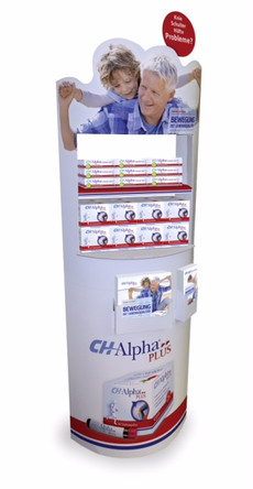 Gütersloh - Mit dem neuen Stand-Display werden die beiden Erfolgsprodukte des CH-Alpha® Sortiments aufmerksamkeitsstark und gut sortiert angeboten – für mehr Erfolg am POS. Neben attraktiven Konditionen erhalten bestellende Apotheken zur Unterstützung der Neukundengewinnung je eine 5er Faltschachtel CH-Alpha® PLUS Trinkampullen gratis zu jeder Monatspackung. Der „zusätzliche Verkäufer“ bietet Platz für bis zu 9 Monatspackungen CH-Alpha® PLUS Trinkampullen und zusätzlich für 12 Tuben des CH-Alpha® Gelenk-Gels. Nur für kurze Zeit und solange der Vorrat reicht, erhalten Sie ein umfangreiches Aktionspaket mit einmaligem Sonderrabatt.