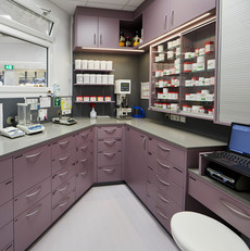 In seiner Gesamtheit präsentiert sich dieser neustrukturierte Bereich in einem pastellfarbigen Ambiente, das eine Wohlfühlatmosphäre verströmt. Auch das übersichtlich angeordnete Mobiliar wirkt sich in seiner ausgerichteten Funktionalität auf einen positiven Arbeitsablauf aus. Zeitsparend wirken die neuen Abläufe und die hygienische Materialauswahl. Der mineralisierte Verbundstoff Corian wird aus reinem Acrylharz hergestellt und wird überwiegend im Gesundheitswesen eingesetzt. Einen frischen Akzent setzen die hell- und dunkelgrauen Steinoberflächen der Arbeitsflächen. Der helle, trittschalldämmende Vinylbodenbelag stellt eine Verbindung zur akustisch hochwirksamen Kassettendecke her. Sowohl der Boden als auch die Decke sorgen so für einen störungsfreien Raumklang. Das ausgewogene Lichtkonzept im Backoffice besteht aus einer LED-Beleuchtung, die durch eine angenehme Farbwärme und blendfreier Bildschirmarbeit arbeitsfördernd wirkt.