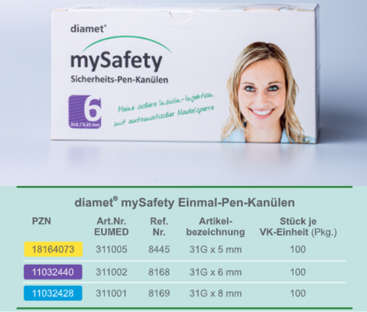 Dresden - Wenn Sie Pflegeeinrichtungen mit Produkten versorgen, können Sie ab sofort diamet mySafety Sicherheits-Pennadeln in den Längen 5, 6 und 8 mm bei uns beziehen.
