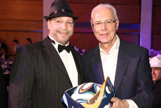 Toni Forster (l.) ersteigerte einen von Franz Beckenbauer handsignierten Fußball. Der Erlös kam der Hilfsorganisation Apotheker helfen e.V. zu Gute.