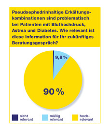 Die Eignung eines Medikaments für einzelne Patientenkohorten ist abhängig von der Wirkstoffzusammensetzung. Dass es Kombinationspräparate gegen Erkältungskrankheiten gibt, die das Sympathomimentikum Pseudoephedrin enthalten, wissen fast alle Befragten. Fälschlicherweise wird aber auch Grippostad C von 29% der Befragten mit dieser Wirkstoffgruppe assoziiert. Dabei handelt es sich hier um eine pseudoephedrin-freie Alternative, die sich aufgrund der einzigartigen 4-er-Wirkstoffkombination aus Chlorphenamin, Paracetamol, Coffein und Vitamin C auch für Risikopatienten mit Diabetes, Asthma oder Bluthochdruck eignet.