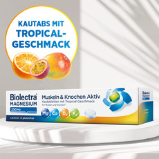 Das gluten- und laktosefreie Biolectra® MAGNESIUM 250mg Muskeln & Knochen Aktiv mit Tropical-Geschmack ist in Packungen mit 30 Kautabletten seit dem 01.10.2024 erhältlich.