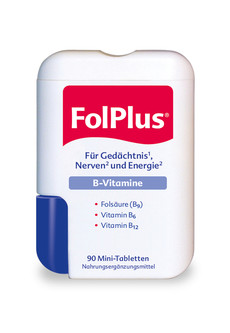 Das Vitamin-B-Trio in FolPlus® bestehend aus 400 Mikrogramm Folsäure, 4 Milligramm Vitamin B6 und 30 Mikrogramm Vitamin B12 ist maßgeblich an der Umwandlung von Homocystein beteiligt. Die Homocystein-Homöostase wird aufrechterhalten und eine Anreicherung unterbunden. Der Homocystein-Spiegel im Blut ist unter Kontrolle. Gedächtnis und Denkvermögen, Nerven- und Immunsystem, sowie Antriebskraft und Energie werden positiv unterstützt. FolPlus® ist auch in Kombination mit Vitamin D3 erhältlich.