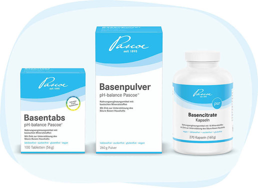 Unsere hochwertigen Basenprodukte – Basentabs, Basenpulver und Basencitrate – enthalten Zink als wertvolle Unterstützung für den Säure-Basen-Haushalt*.