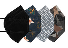 Alternativ zur klassischen FFP2-Maskenfarbe Weiß ist die TECHNIMASK 2.0 in neuen Farben und Mustern erhältlich. Produktname und CE-Kennzeichnung sind hier nicht aufgedruckt, sondern über eine dezentere Prägung auf der Maske angebracht. Neben einer vollständig in Schwarz gehaltenen Variante stehen auch ein graues Karomuster, eine Camouflage-Bedruckung in Braun- und Grautönen wie auch eine dunkelblaue Maske mit floralem Motiv zur Verfügung