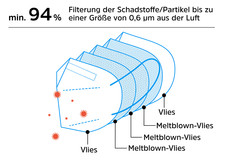 Die TECHNIMASK FFP2 ist eine partikelfiltrierende Halbmaske mit hervorragender Filterleistung. Die insgesamt fünf Lagen teilen sich in zweimal Vlies und dreimal Meltblown-Vlies auf. Anstatt der oft nur ein oder zwei Lagen Meltblown bei den FFP2-Masken anderer Hersteller. Die TECHNIMASK FFP2 filtert mindestens 94% der Schadstoffe/Partikel bis zu einer Größe von 0,6 μm aus der Luft. Die CE-Zertifizierung nach der EN 149:2001 + A1:2009 und der Richtlinie 2016/425/EU erfolgte durch das Prüfinstitut FORCE Certification A/S, 2605 Brøndby (Code Nr. 0200). Dieses führt zusätzlich kontinuierliche Produktüberwachungen durch.