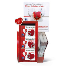 Im Paket enthalten sind ein bewegter Aufsteller, ein Deckenhänger, zwei Poster im DIN A1-Format, Jumbo Faltschachteln und anschauliche Kundenbroschüren sowie ein handlicher HV-Aufsteller, bestückt mit sechs Packungen Tromcardin® complex à 120 Tabletten. Exklusiv bei dieser Aktion gibt es zu jeder der sechs Packungen einen Herz-Schlüsselanhänger gratis dazu. Ergänzt wird das Aktionsangebot durch einen kurzen Spot für das Apotheken-TV.