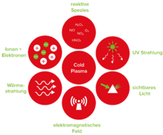 Dieser gasförmige „Materiecocktail" hat spezielle Eigenschaften, die sich u.a. die Medizin zunutze macht. Die in kaltem Plasma erzeugten Wirkstoffe (reaktive Spezies) können auf verschiedene Arten mit Zellen wechselwirken. Die Effekte sind physikalisch (z.B. Rekombination oder Abregung angeregter Moleküle/Atome an der Oberfläche) oder chemisch (z.B. Wasserstoff-Denaturierung durch Wechselwirkung von Hydroxyl-Radikalen). Bei prokaryotischen Zellen erfolgt dadurch direkt eine Zerstörung zellulärer Makromoleküle einschließlich der DNA und das Bakterium wird inaktiviert. Im Gegensatz dazu sind menschliche eukaryotische Zellen deutlich besser geschützt und werden somit nach bisherigen Erkenntnissen durch die Behandlung mit dem KAP nicht geschädigt.