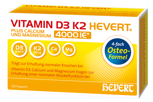 Nussbaum - Die „4-fach Osteo-Formel“ ist bei Vitamin D3 K2 Hevert plus Calcium und Magnesium 4000 IE Programm. Denn für den Knochenstoffwechsel spielen nicht nur die Vitamine D3 und K2 eine wichtige Rolle, sondern auch die Mineralien Calcium und Magnesium. Vitamin D, Calcium und Magnesium sorgen zusätzlich für leistungsfähige Muskeln. Daher sollte dieses Quartett kombiniert eingenommen werden, denn die Mikronährstoffe agieren synergistisch. Nur so kann der größtmögliche Effekt in Bezug auf die Gesundheit von Knochen und Muskeln erzielt werden. Das Präparat von Hevert-Arzneimittel ist das einzige im Markt mit dieser 4-fach-Kombination.