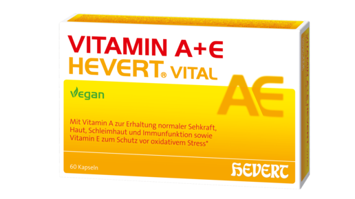 In dem neuen Präparat Vitamin A+E Hevert Vital werden die beiden fettlöslichen Vitamine A und E kombiniert. Beide Vitamine ergänzen und verstärken sich zum Beispiel in ihrer Wirkung bei der Erhaltung gesunder Haut und Schleimhäute, was unter anderem wichtig ist, um Krankheitserreger erfolgreich abzuwehren. Außerdem schützt Vitamin E Vitamin A vor oxidativem Abbau im Verdauungstrakt und verbessert seine Aufnahme ins Blut. Vor allem ältere Menschen, Veganer und Vegetarier sowie Menschen, die viel am Bildschirm sitzen und ihre Augen, aber auch die Gesundheit ihrer Haut schützen möchten, sollten die beiden essentiellen Vitamine supplementieren. Vitamin A+E Hevert Vital ist vegan, laktose- und glutenfrei und ohne Farb- und Konservierungsstoffe.