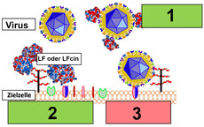 Abb. 1) LF dockt an Virus an - keine Infektion; 2) LF verhindert das Andocken an Rezeptor - keine Infektion; 3) Virus dockt an Zelle an - Infektion. Der Mechanismus der antiviralen Wirkung von Lactoferrin. Lactoferrin (LF) oder das Abbauprodukt Lactoferricin (LFcin) verhindert die Anheftung des Virus an die Zielzellen durch Bindung an den Virusrezeptor auf den Zielzellen oder durch Bindung an das Virus (2).