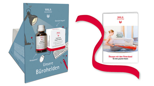 dekoration. Das aufmerksamkeitsstarke Design lädt Ihre Kund:innen dazu ein, mehr über die WALA Bürohelden in Ihrer Apotheke zu erfahren. Ein kompaktes Verkaufsdisplay für den HV-Tisch sowie dazu passende Regalschienen wecken zusätzlich das Interesse. Fitnessbänder aus biologisch abbaubarem Naturlatex inklusive Übungsanleitung runden das Aktionspaket ab. Diese unterstützen Ihre Kund:innen dabei, den Rücken nachhaltig zu stärken.