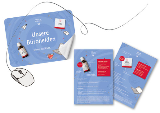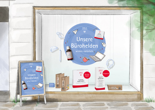 Ihren Abverkauf unterstützt WALA mit einer hochwertigen Schaufensterdekoration und einem separat bestellbaren Gehwegposter. Das aufmerksamkeitsstarke Design lädt Ihre Kund:innen dazu ein, mehr über die WALA Bürohelden in Ihrer Apotheke zu erfahren.
