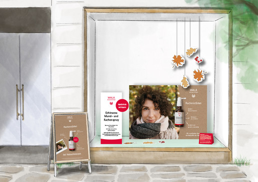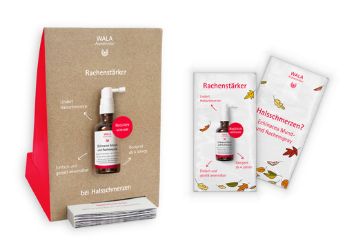 Das Aktionspaket „Rachenstärker“ enthält jeweils zehn Packungen Echinacea Mund- und Rachenspray, den neuen Patientenflyer „Halschmerzen & Co.“ sowie Taschentücher im attraktiven Herbst-Design. Im Rahmen der Aktion gibt es einen Barrabatt von 20 Prozent auf den Warenwert. Darüber hinaus sind weitere Werbemittel zum WALA Echinacea Mund- und Rachenspray optional und kostenfrei erhältlich: Holen Sie sich mit unserer schönen und aufmerksamkeitsstarken Schaufensterdekoration den Herbst auch in Ihre Apotheke. Das enthaltene Plakat kann sowohl hängend als auch stehend verwendet werden und ermöglicht in Verbindung mit dem herbstlichen Dekorationsset aus Blättern und Beeren eine ansprechende und individuelle Schaufensterdekoration. Zusätzlich weckt ein kompaktes Verkaufsdisplay das Kundeninteresse am HV-Tisch.