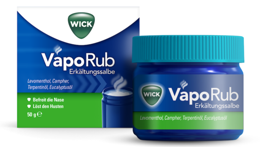 WICK VapoRub Erkältungssalbe, Zus.: 100 g Salbe enth.: Levomenthol 2,82 g, racemischer Campher 5,46 g, gereinigtes Terpentinöl 4,71 g, Eukalyptusöl 1,35 g. Sonst. Bestandt.: Virginisches Wacholderholzöl, Thymol, Weißes Vaselin. Anwendungsgebiete: Zur Besserung des Befindens bei Erkältungsbeschwerden der Atemwege (Schnupfen, Heiserkeit, Entzündung der Bronchialschleimhaut mit Symptomen wie Husten und Verschleimung). Gegenanzeigen: Überempfindlichkeit gg. die Wirkstoffe od. einen der sonst. Bestandt., Anw. auf Schleimhäuten, vorgeschädigter od. entzündeter Haut, offenen Wunden; Verbrennungen od. bei Haut- und Kinderkrankheiten mit Exanthem; Asthma bronchiale, Keuchhusten sowie Pseudokrupp u. and. Atemwegserkrank. mit ausgeprägter Überempfindlichkeit der Atemwege (Wirkstoffe können beim Einatmen zur Verkrampfung der Bronchialmuskulatur führen); akute Lungenentzündung; Säugl. und Kleinkdr, unter 2 J; bei Kdrn. unter 6 J. nicht zur Inhalation. Nebenwirkungen: Überempfindlichkeitsreaktion der Haut, Kontaktekzem. Halluzinationen. Krampfanfall. Augenreizung (bei Inhalation). Bei Inhalation: Hustenreiz, Verstärkung eines Bronchospasmus, Atemwegsobstruktion mit pfeifender Atmung, Atembeschwerden, Atemnot, asthmaähnl. Zustände bis hin zum Atemstillstand. Erythem, Hautreizung, Schleimhautreizung (bei Inhalation). Verbrennungen am Applikationsort. Abgabestatus: Freiverkäuflich. Pharmazeutischer Unternehmer: WICK Pharma, Zweigniederlassung der Procter & Gamble GmbH, D-65823 Schwalbach Stand: März 2018.