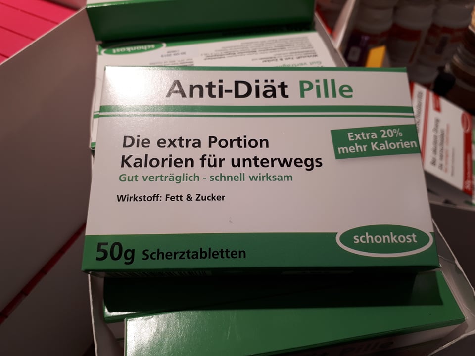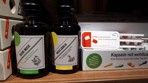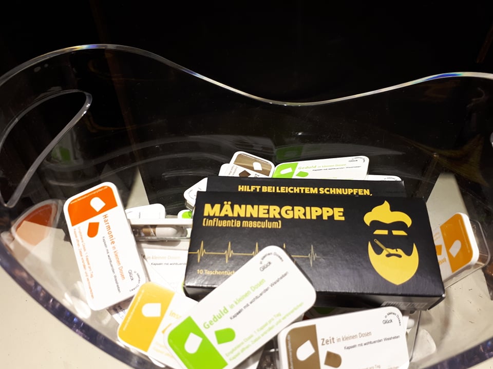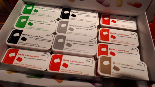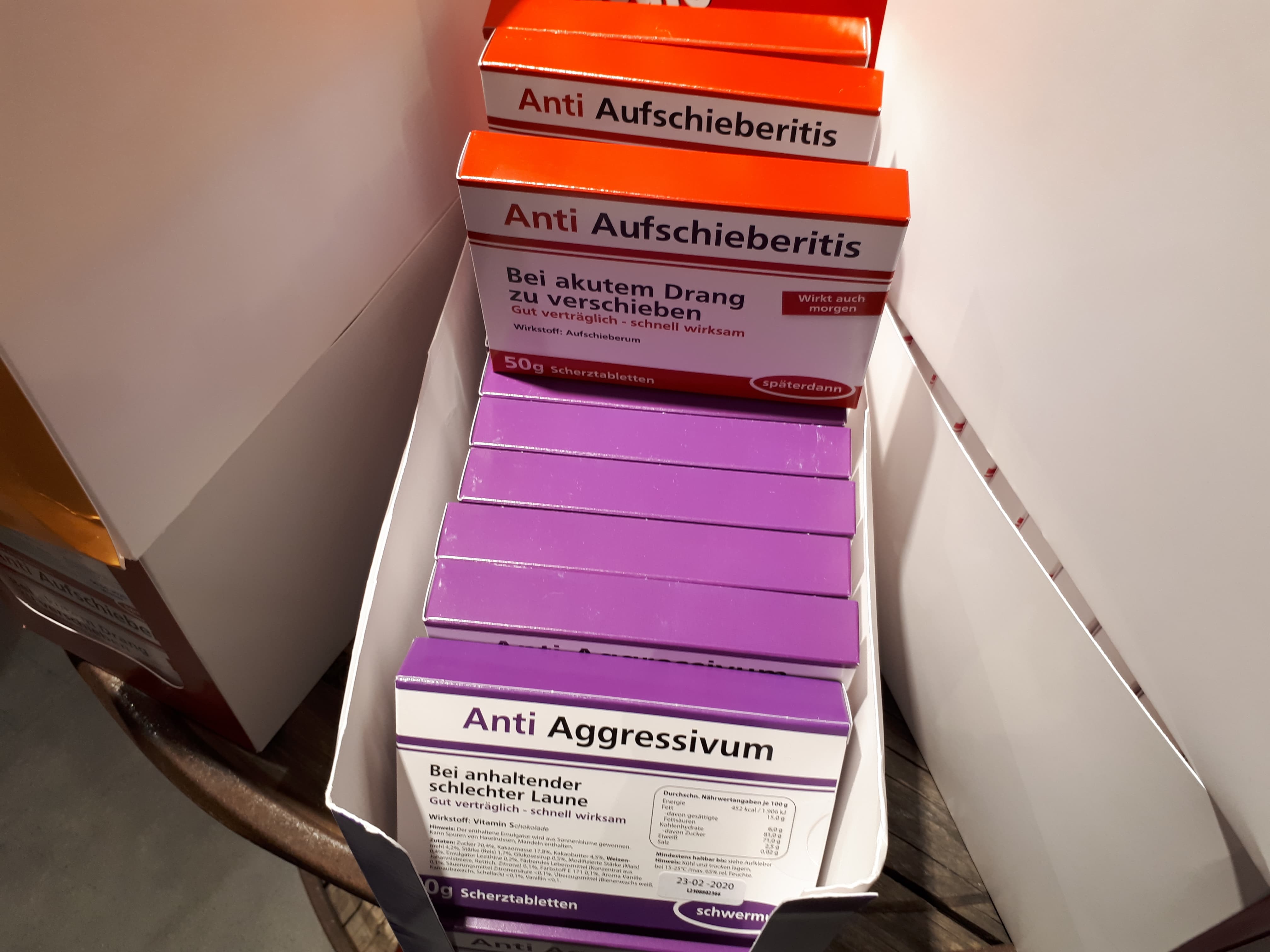 Ein bekannter Geschenkartikel-Laden zeigt in seinem Sortiment immer mehr Present-Ideen im Apothekendesign oder in Pillen Form. Bei den verschiedenen Indikationen findet sich mit Sicherheit das richtige Geschenk für den mehr oder weniger beliebten Kollegen oder Chef.
