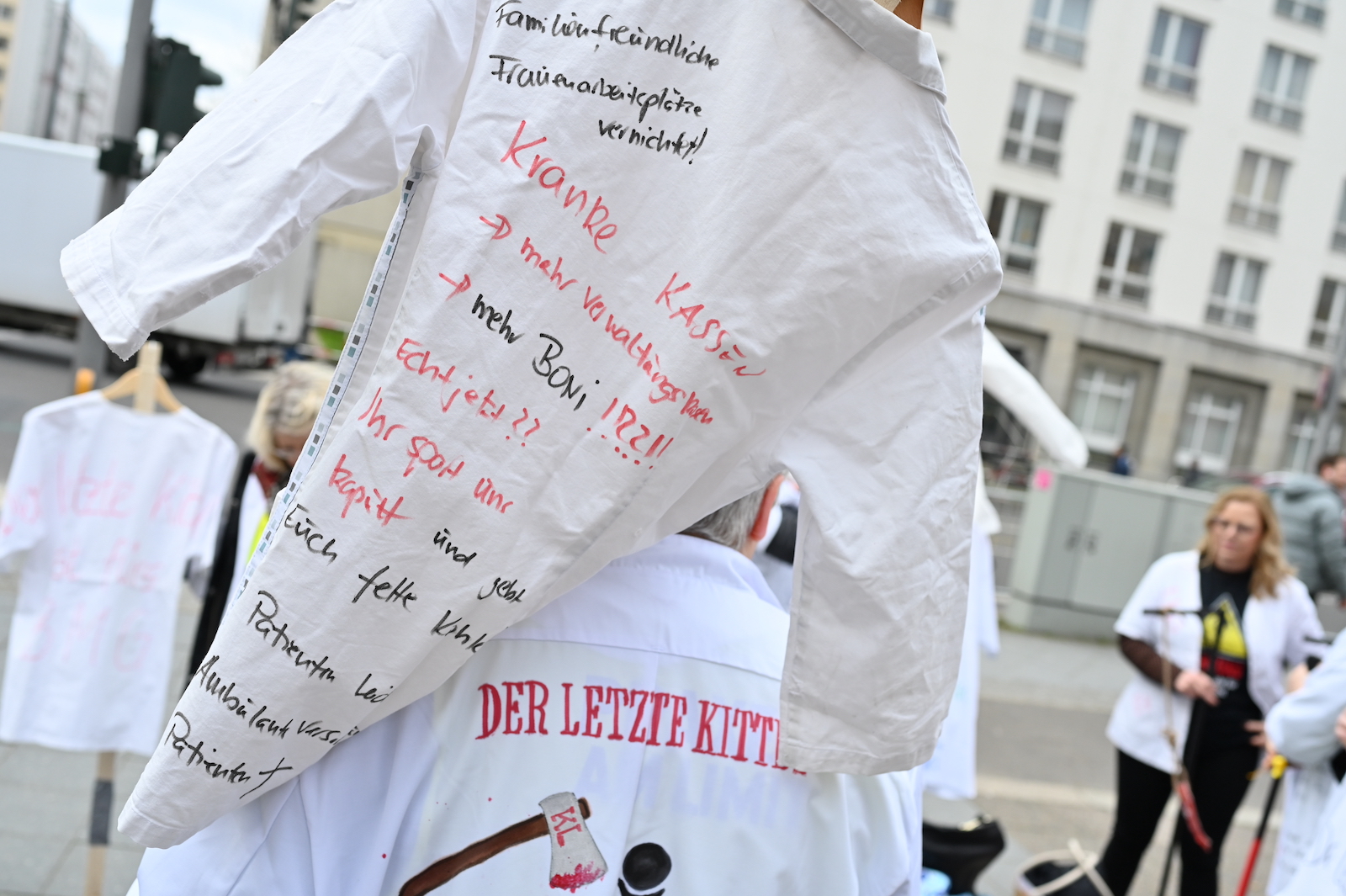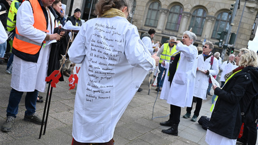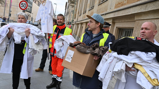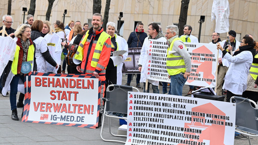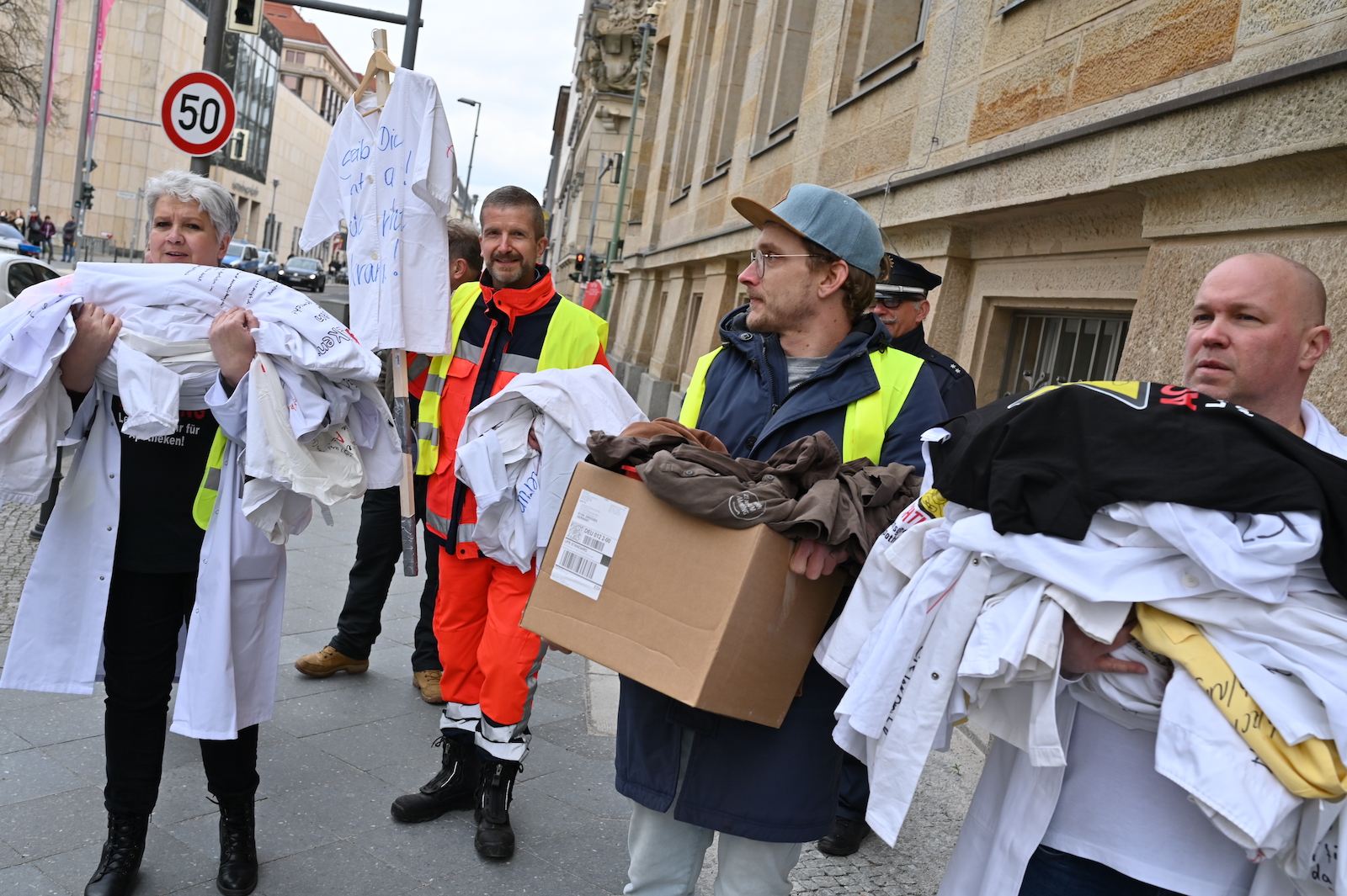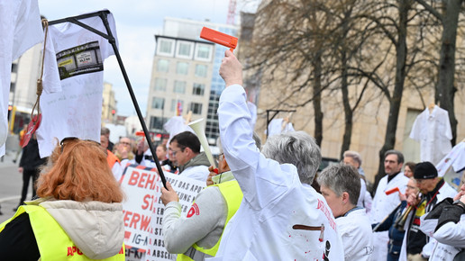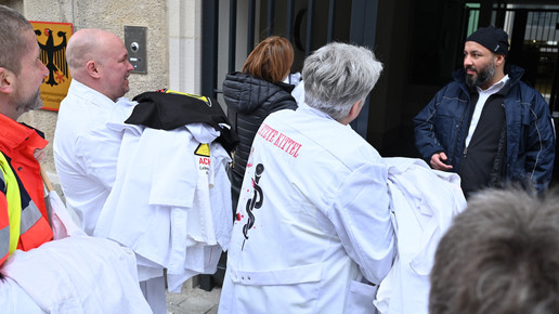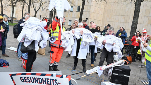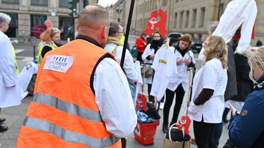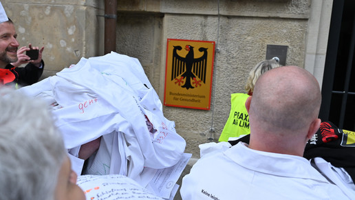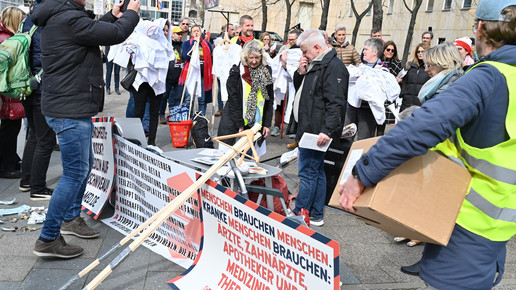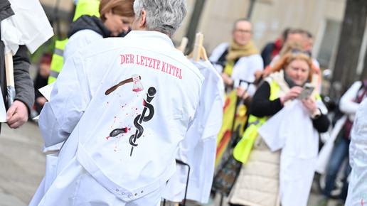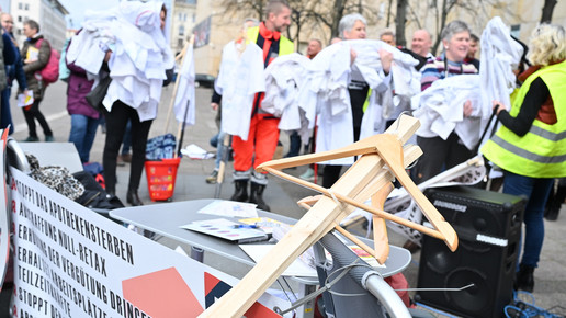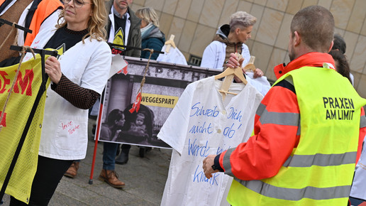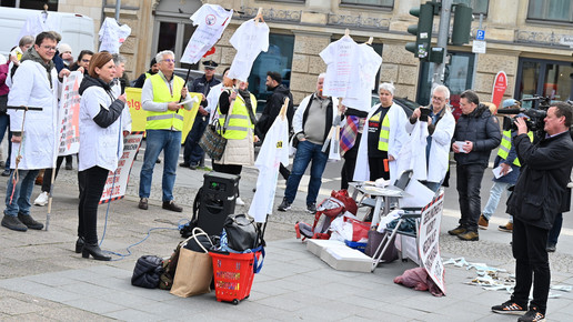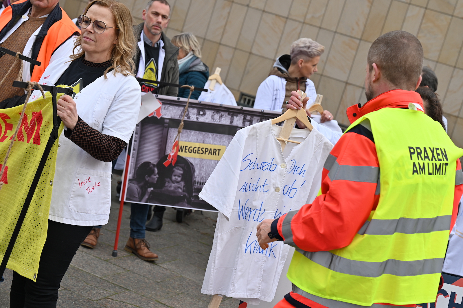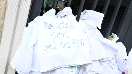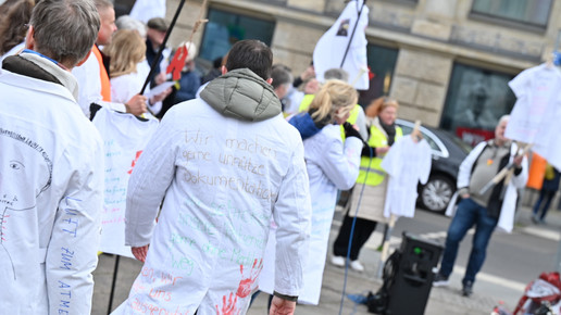 Fachkräftemangel, unzureichende Honorierung und eine überbordende Bürokratie zählen zu den zentralen Themen der Aktion „Der letzte Kittel“. Die Kundgebung und Übergabe in Bildern.