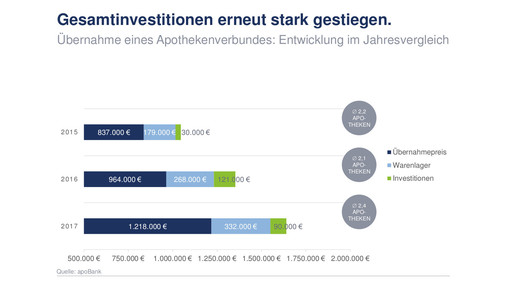 Wer einen Apothekenverbund übernimmt, zahlt durchschnittlich mehr als eine Million Euro für 2,2 Apotheken.Grafik: Apobank