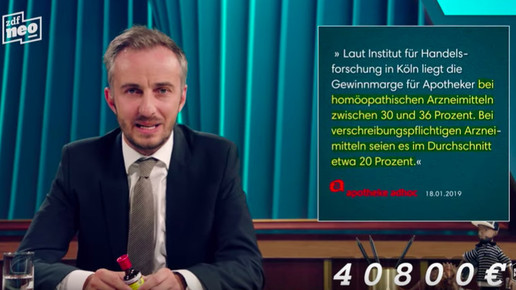 Jan Böhmermann durchleuchtet in seiner aktuellen Sendung „Neo Magazin Royale“ das Geschäft mit der Homöopathie. Anlass war die Abmahnung, die der Hersteller Hevert an Natalie Grams geschickt hat.