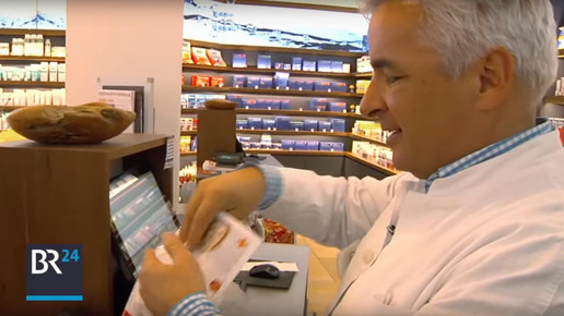 Flyer gegen Bayer: Apotheker Timo Ried aus Neu-Ulm macht gegen Monsanto mobil. Er weist seine Kunden auf Alternativpräparate zu den Bayer-Bestsellern hin.