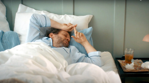 TV-Spot: Christian Ulmen liegt krank im Bett, seine Frau bestellt schnell bei Shop Apotheke.Screenshot