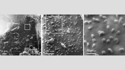 An der Universität Bielefeld konnten Wissenschaftler erstmals Aufnahmen von Sars-CoV-2 mittels Heliumionen-Mikroskop festhalten. Die Bilder helfen beim Verständnis der Zellinfizierung.