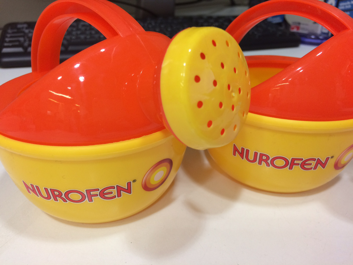 Für Strand und Buddelkasten gibt es die Nurofen-Gießkanne. Foto: APOTHEKE ADHOC