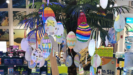 Die Insel am Westring Apotheke in Wildeshausen hat die zentrale Palme in der Offizin mit bemalten Ostereiern von Kindern geschmückt.Foto: Insel am Westring Apotheke
