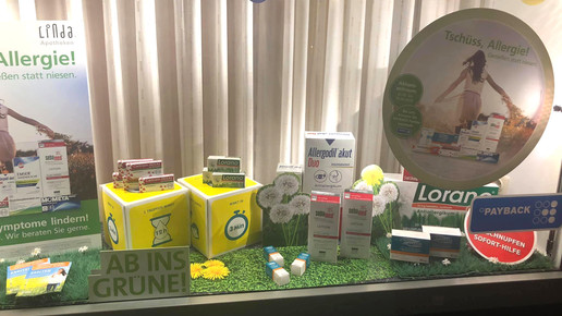 Die Schaufenster-Deko zeigt Produkte für Allergiker.Foto: Viktoria-Apotheke
