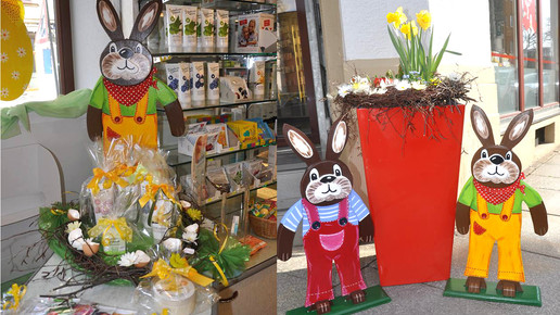 ... hat in und vor der Apotheke mit großen Holzhasen dekoriert. Foto: Ostend-Apotheke
