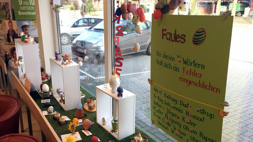 Tauschgeschäft: Die Linden-Apotheke im niedersächsischen Eystrup hat Kinder aufgefordert, ein ausgeblasenes Hühnerei zu bemalen und in die Offizin zu bringen. Foto: Linden-Apotheke Eystrup