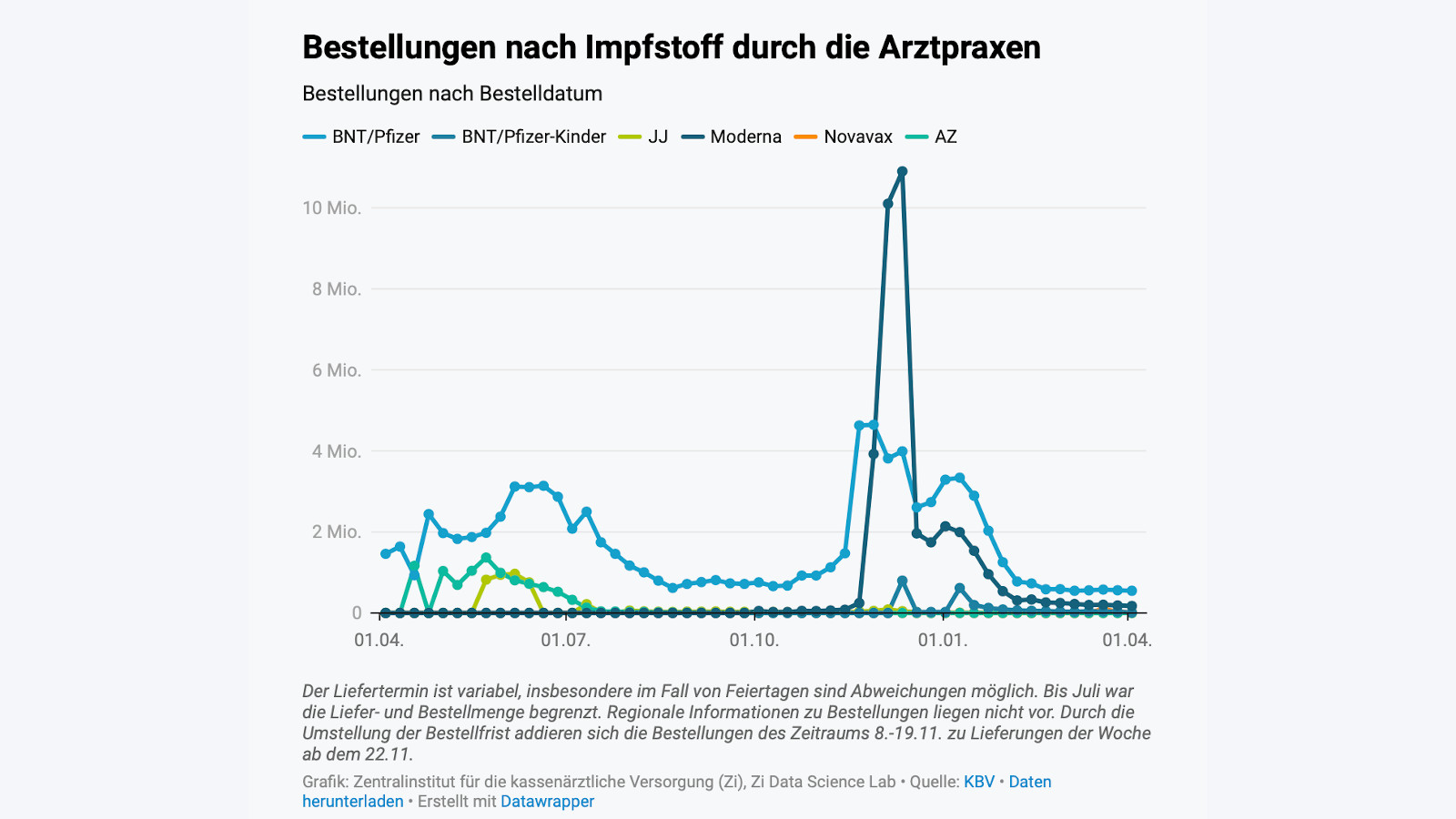 Biontech war stets der beliebteste Impfstoff, am Jahresende fehlte Comirnaty allerdings, sodass Moderna bestellt wurde.Grafik: Zi