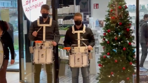 Die Blaskapelle Happy Trumpets aus Ahlen gab ein Überraschungskonzert und versüßte dabei auch den Apothekenangestellten und -kund:innen vor Bußmanns Apotheke Kerkmannplatz den Weihnachtseinkauf.