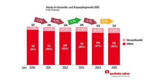 Das Geschäft mit Apothekenkosmetik verlagert sich immer stärker in das Internet. Während die Verkäufe in der Offizin 2015 nur leicht zunahmen, konnten die Versandapotheken deutlich punkten: Der Versandhandelsanteil lag erstmals bei 15 Prozent – 2010 ware es noch 9 Prozent. Besonders medizinische Marken wurden nachgefragt.