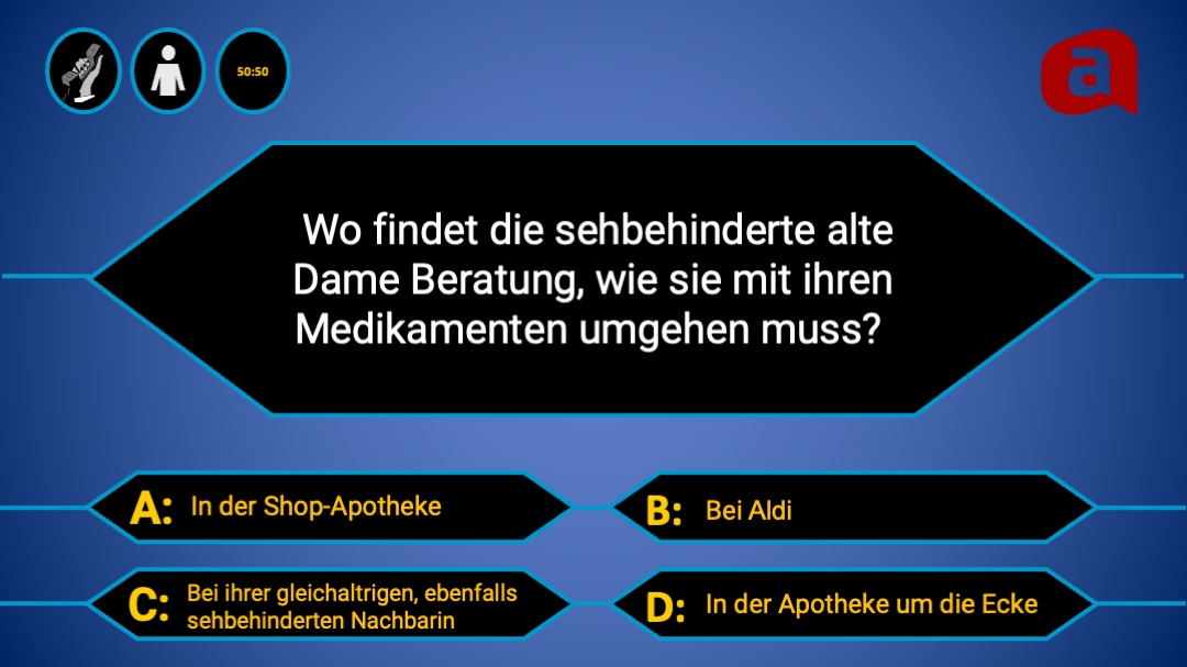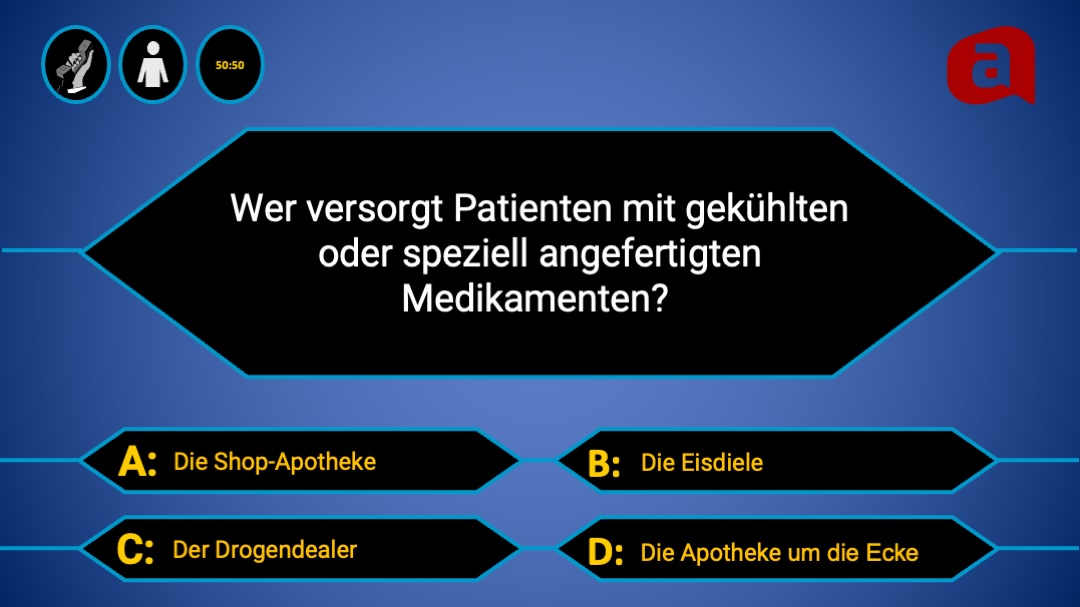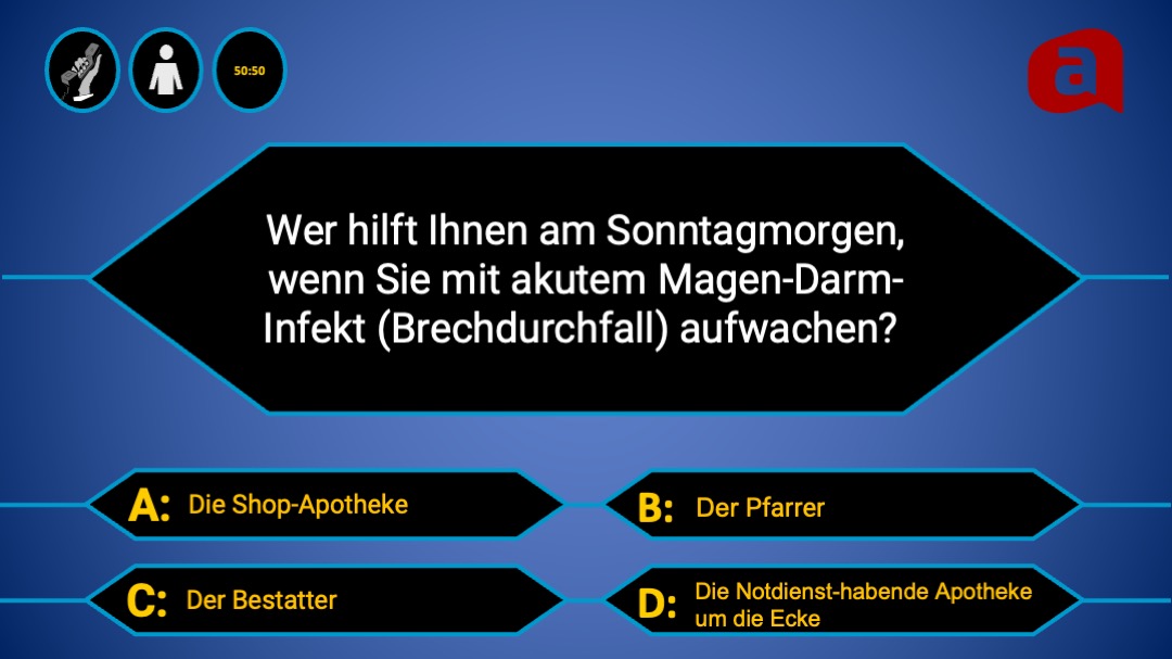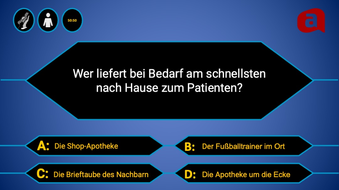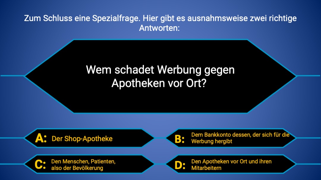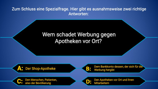 Michaela Axtner ist Chronikerin, dass ihre Stammapotheke schließen musste, hat sie hart getroffen. Dass jemand wie Moderator Günther Jauch hingegen Werbung für einen ausländischen Versender-Konzern macht, versteht sie nicht. Sie hat ihm Fragen zur Apotheke im „Wer wird Millionär“-Format geschickt. Die 65-Jährige will mit den „kleinen Denkanstößen“ zeigen, dass der TV-Promi mit seiner Werbung zum Rückgang der Vor-Ort-Apotheken beiträgt.