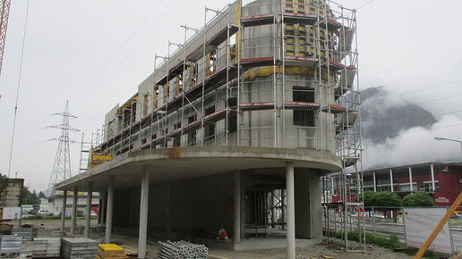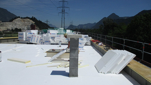 Anfang Juni wurden die Massivbauarbeiten abgeschlossen. Danach gingen die Dachdecker an die Arbeit und die Fassade wurde angebracht.Foto: Peneder