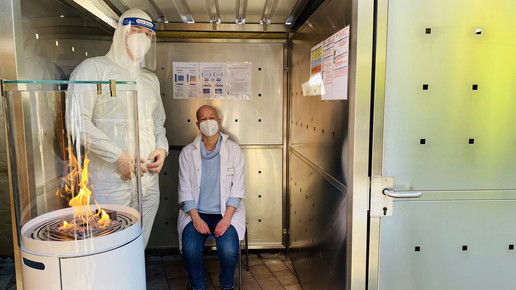 Testen statt Donut: Die Löwen Apotheke in Feuchtwangen untersucht Kunden in einem mobilen Anhänger.Foto: Löwen Apotheke