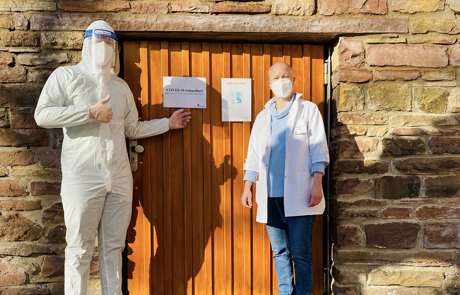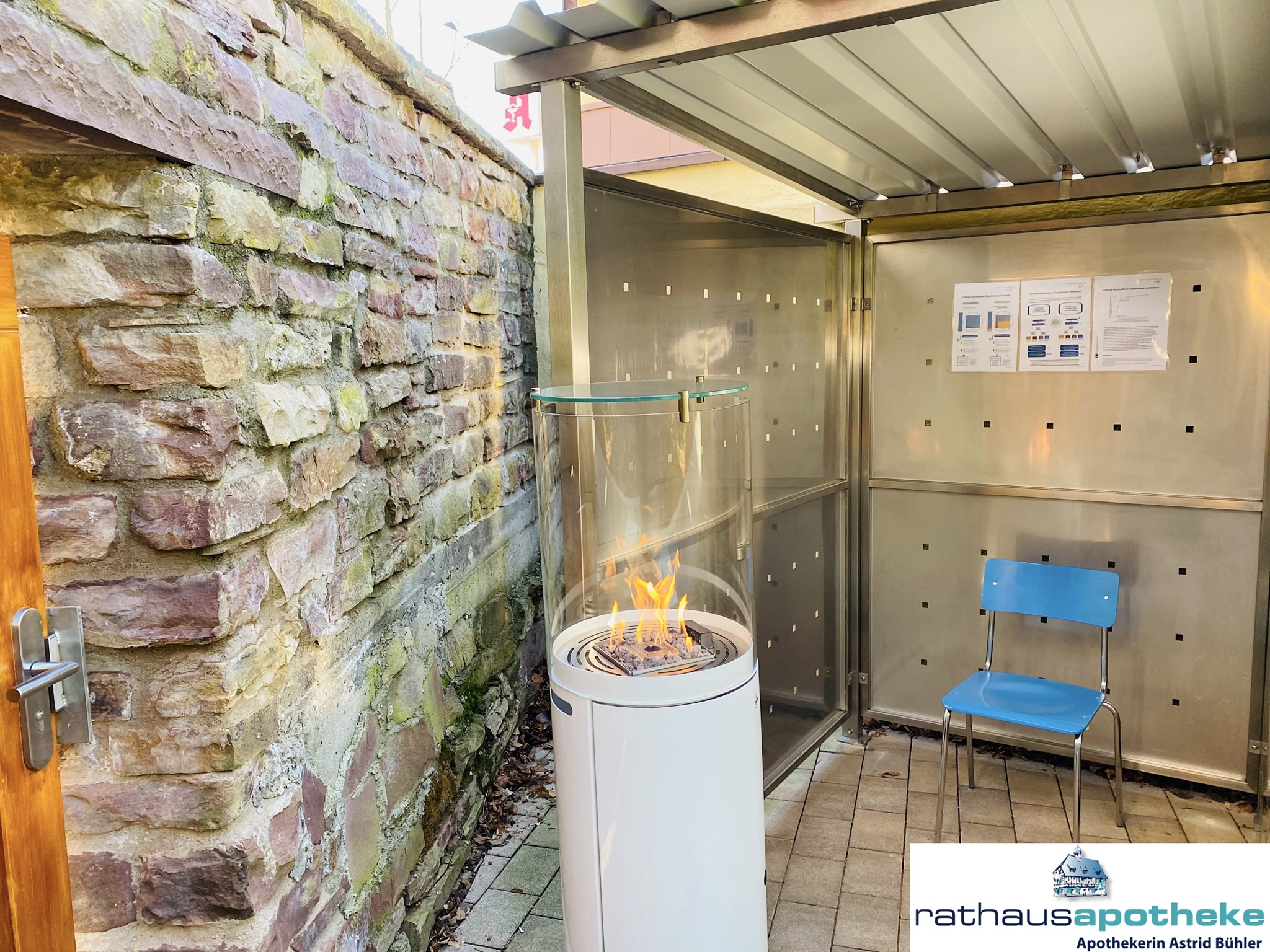 Die Wegbeschreibung: Folgen sie unserer Schaufensterfront entlang, am 24-h-Abholautomaten und Backsteinmauer vorbei, bis sie zur Holztüre mit der Aufschrift „COVID-19-Schnelltest“ ankommen. Foto: Rathaus-Apotheke