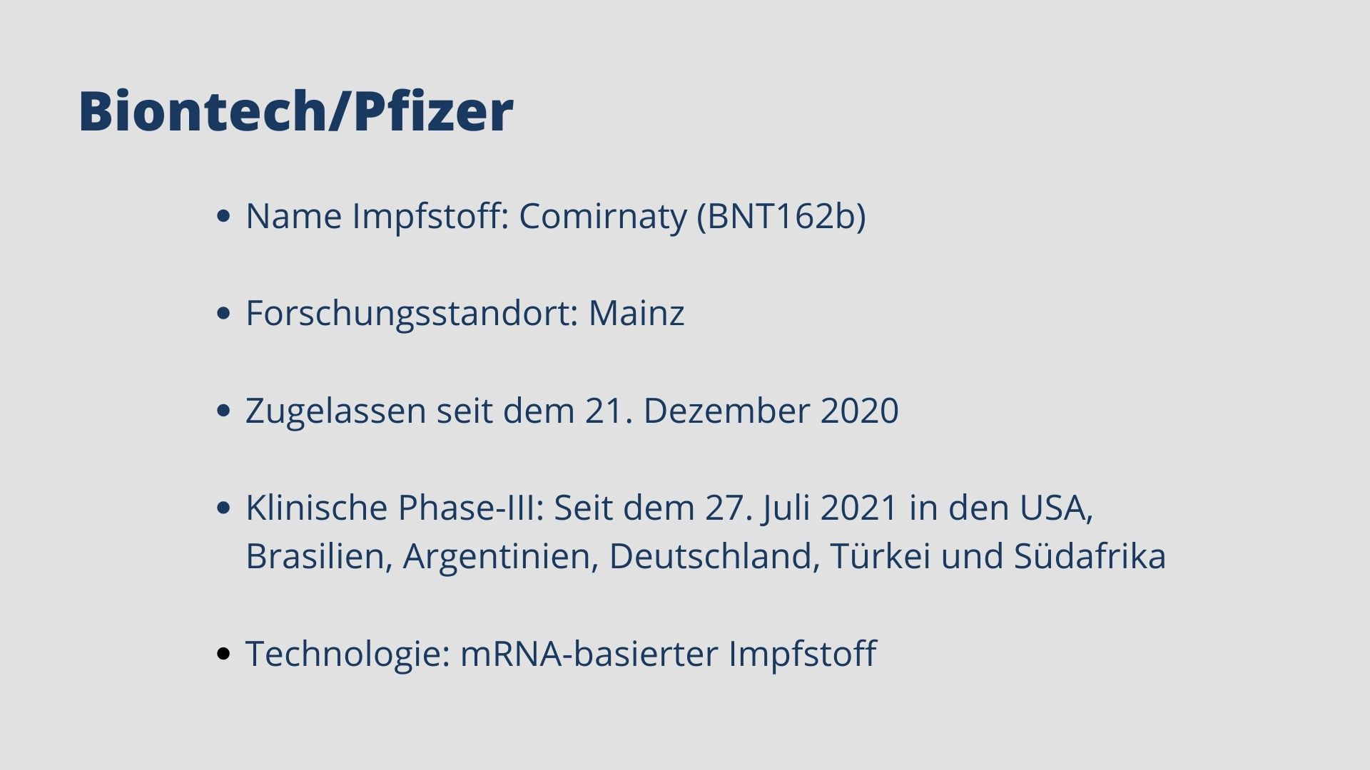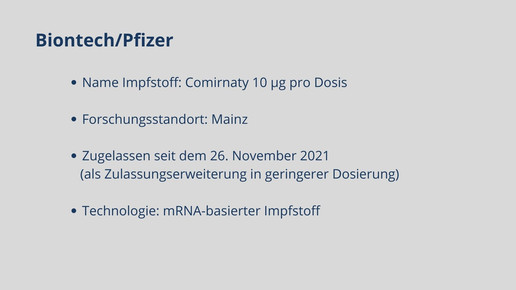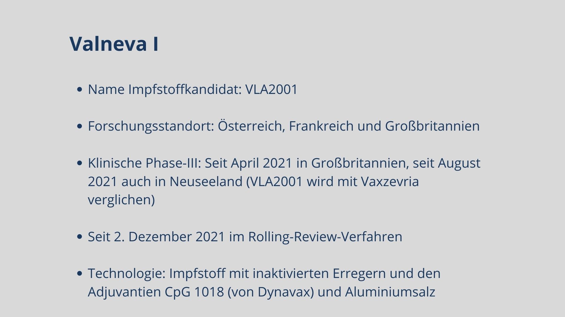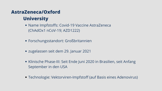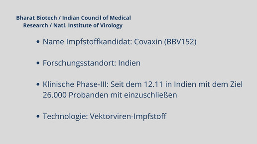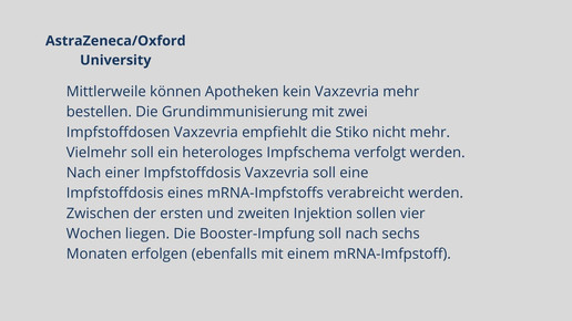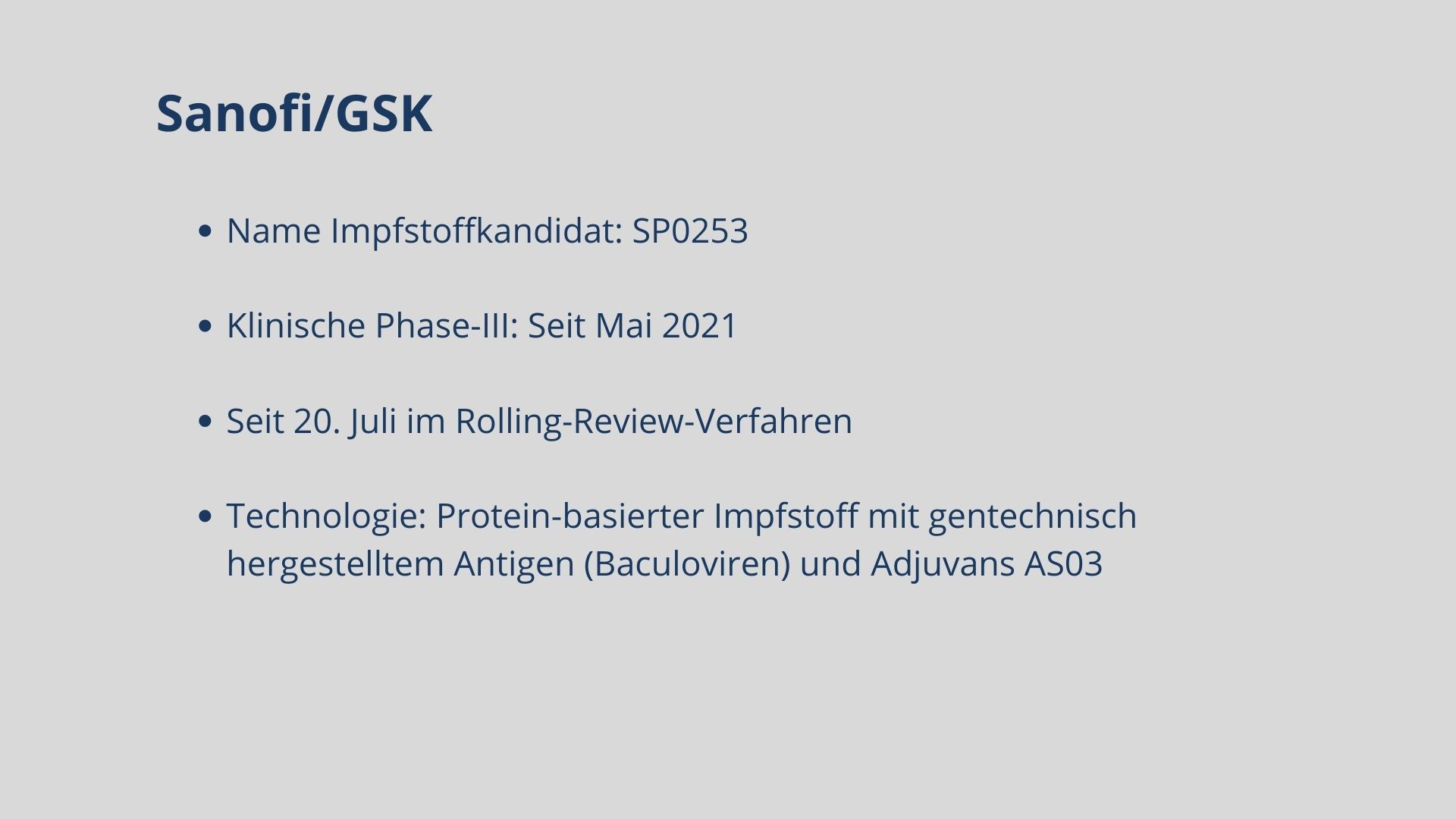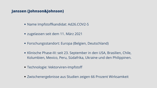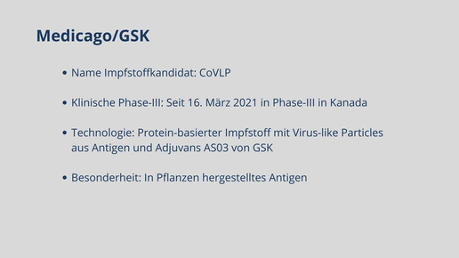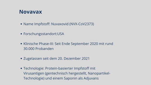 Mittlerweile sind fünf Impfstoffe zugelassen. Biontech, Moderna, AstraZeneca, Janssen und Novavax haben eine bedingte Marktzulassung für ihre Impfstoffkandidaten erhalten. Weitere Kandidaten befinden sich in Phase-III, darunter Vektor-, mRNA- und Totimpfstoffe.