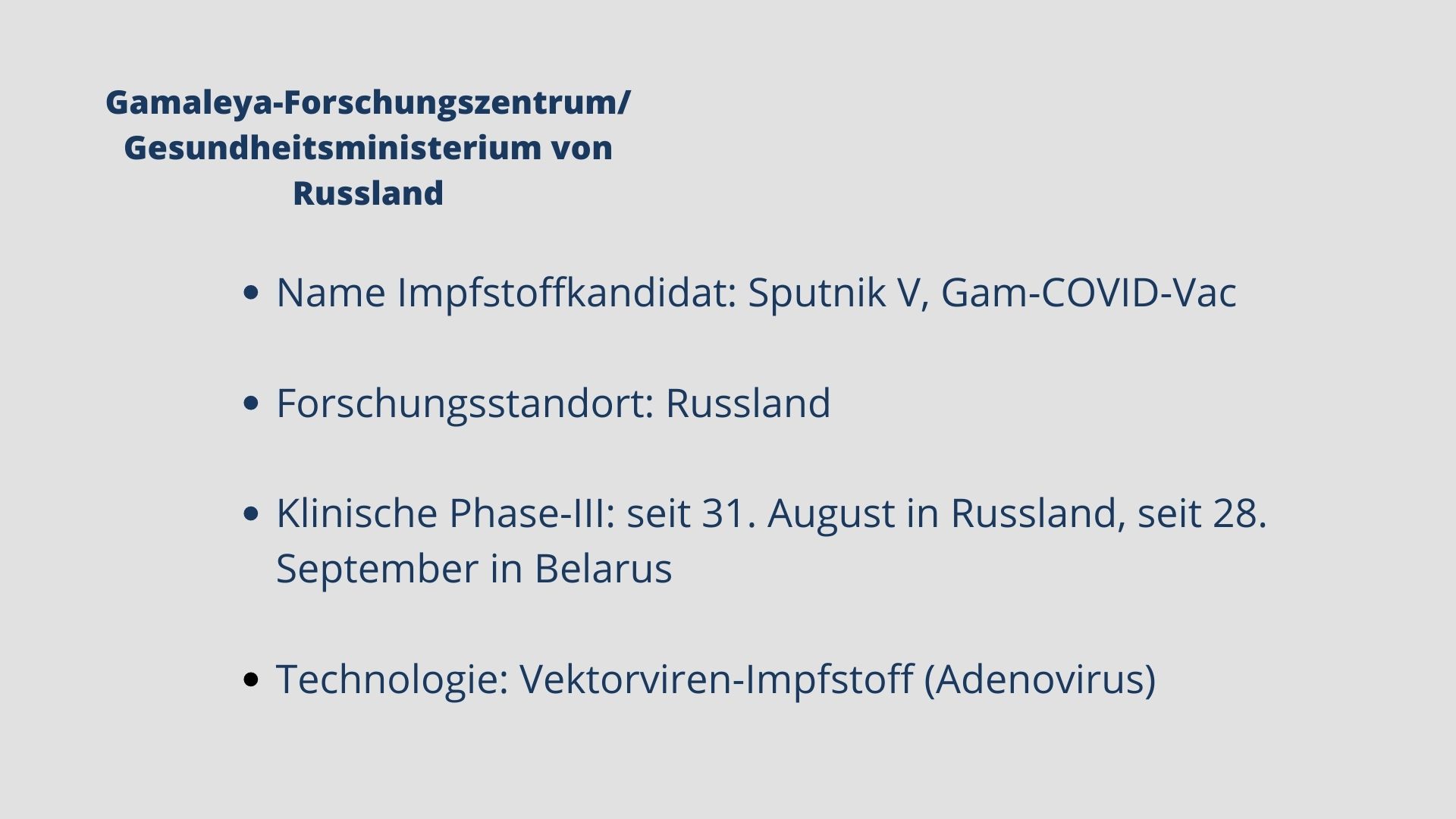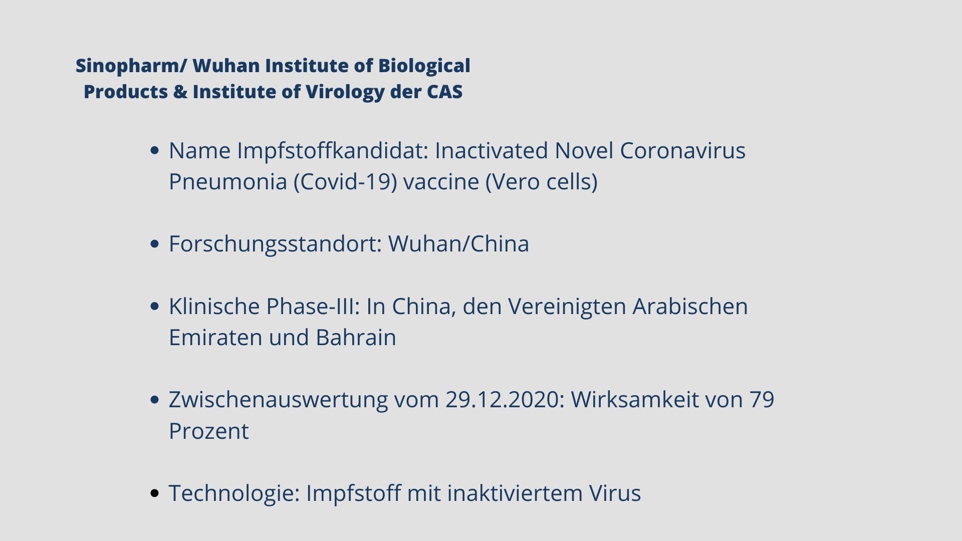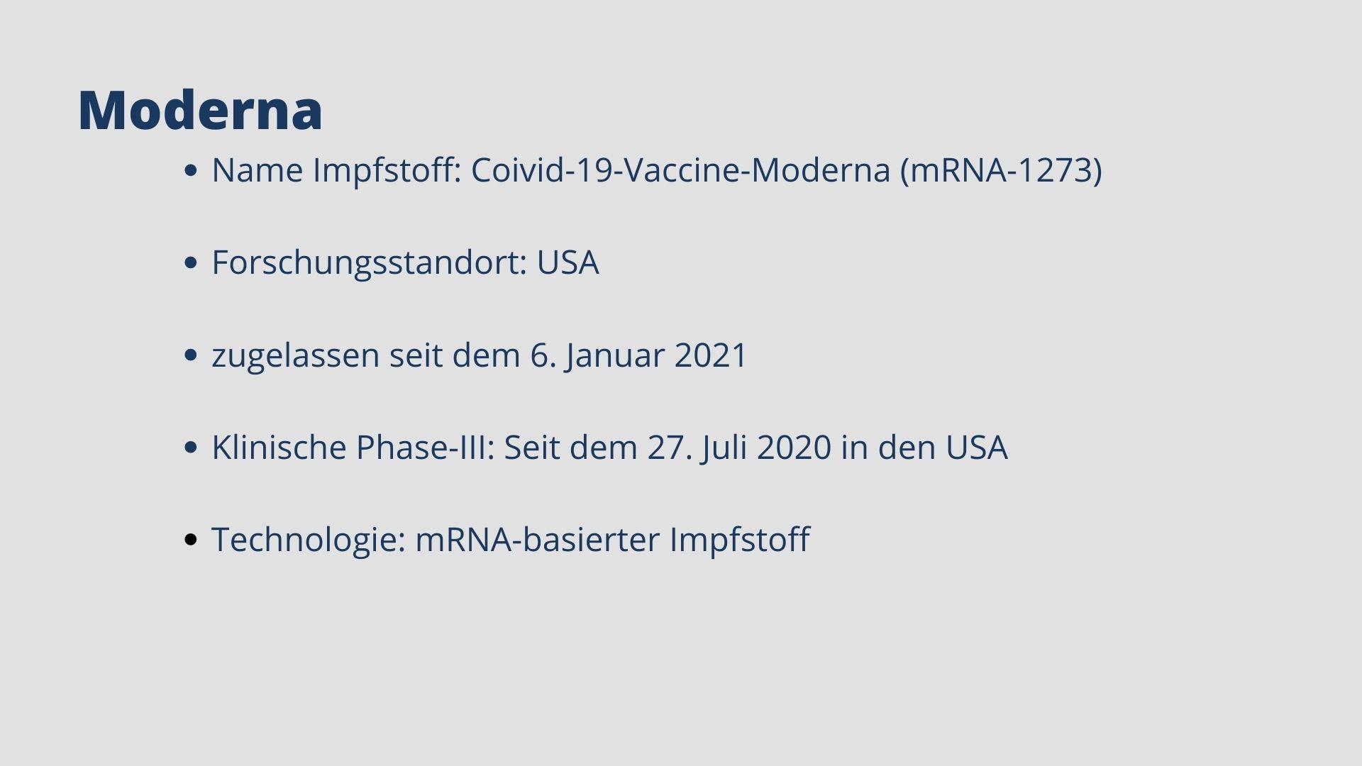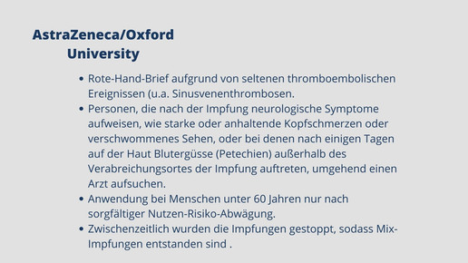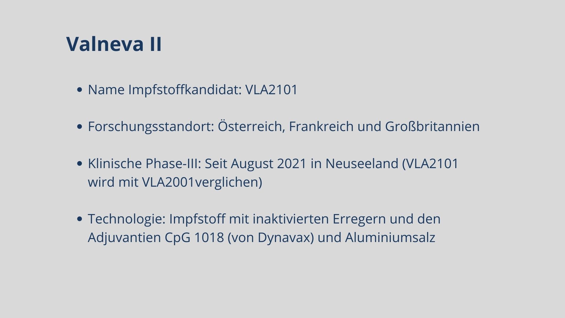 Mittlerweile sind fünf Impfstoffe zugelassen. Biontech, Moderna, AstraZeneca, Janssen und Novavax haben eine bedingte Marktzulassung für ihre Impfstoffkandidaten erhalten. Weitere Kandidaten befinden sich in Phase-III, darunter Vektor-, mRNA- und Totimpfstoffe.