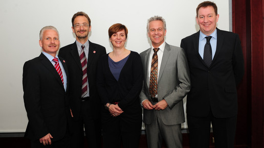 Die Parmapharm war 2011 bei der Genossenschaft eingestiegen (v.l.n.r.: Stuhldreier, Dr. Harald Perschbacher (Aufsichtsrat Parmapharm), Susanne Lorra (Vorstand Gesine), Worch und Dirk Ehrich (Vorstand Gesine).Foto: Elke Hinkelbein
