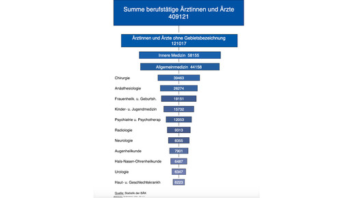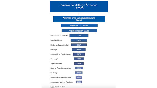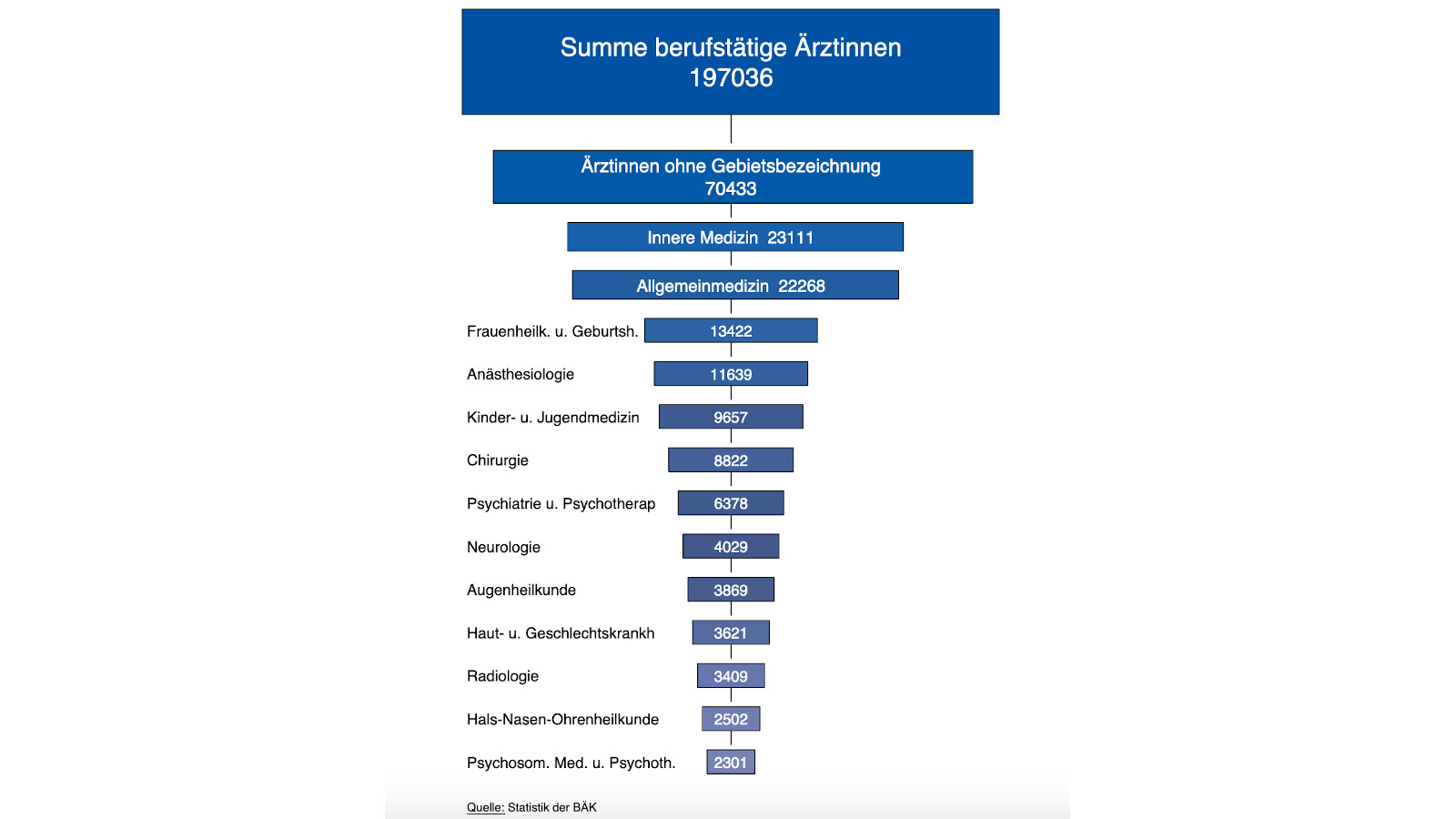 Bei Ärztinnen ist Gynäkologie nach Innere und Allgemeinmedizin das häufigste Fachgebiet.Grafik: BÄK