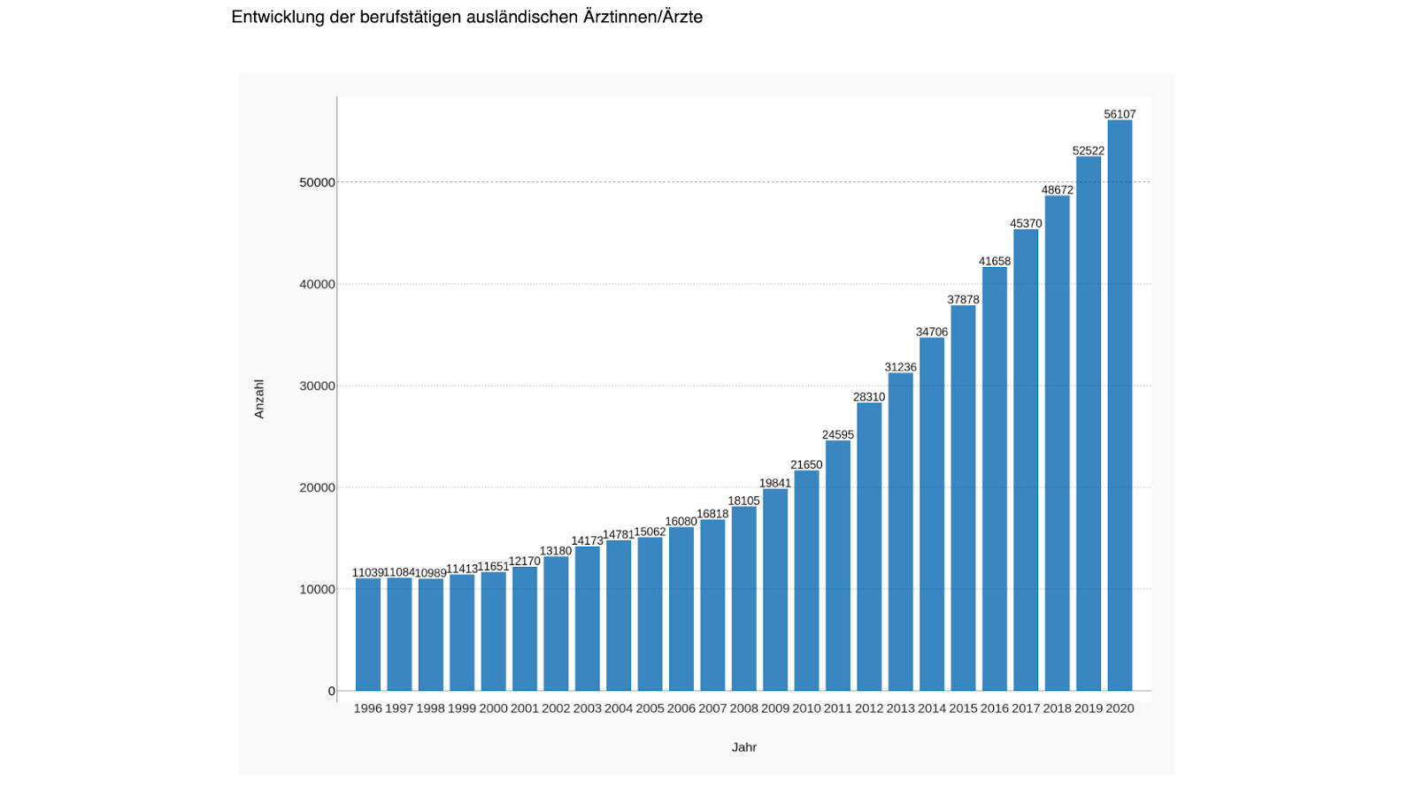 Auch die Zahl der ausländischen Ärzt:innen wächst.Grafik: BÄK