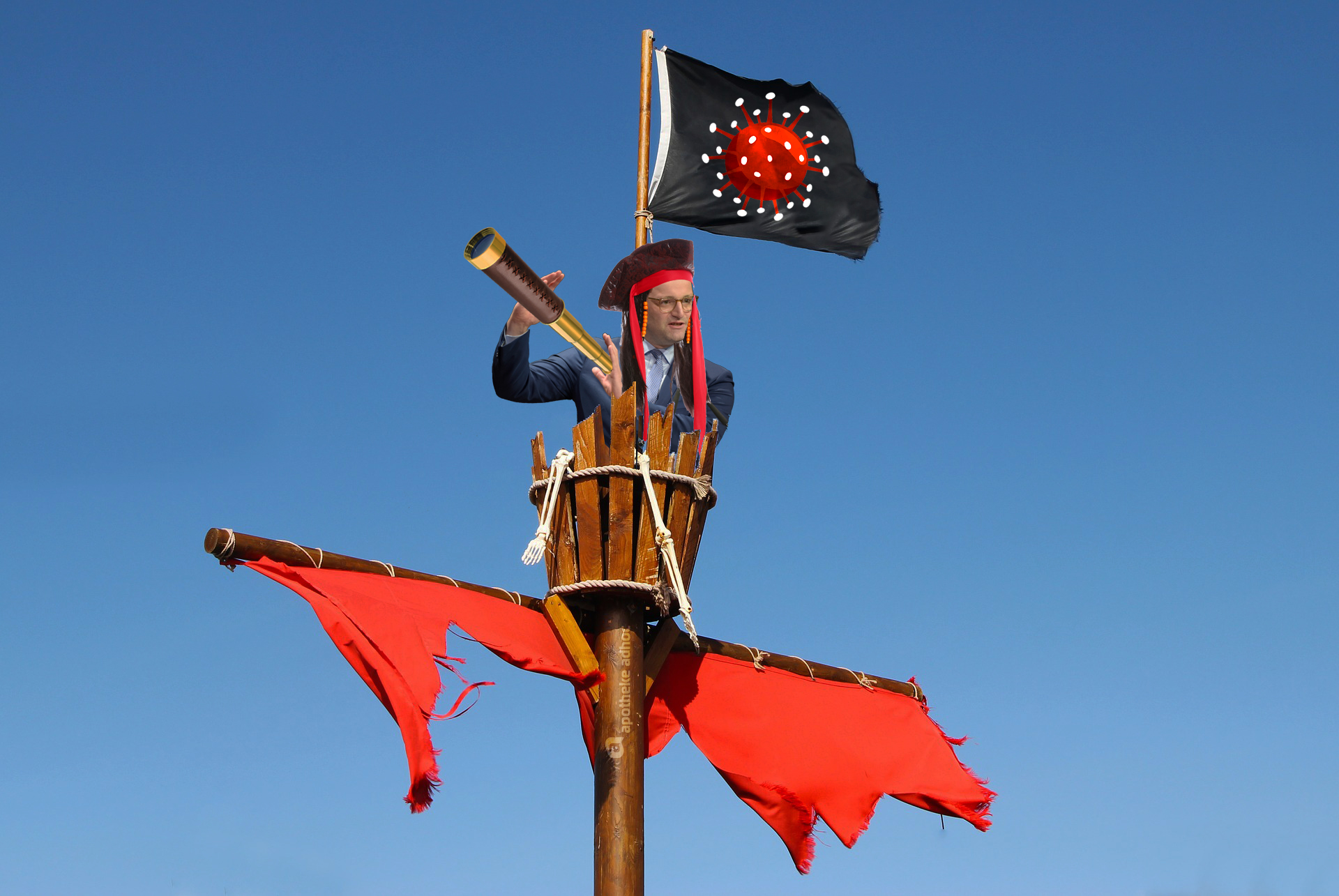 Captain Jens Sparrow stellt etwas in Aussicht. Land. Oder Impfstoff.Montage: APOTHEKE ADHOC