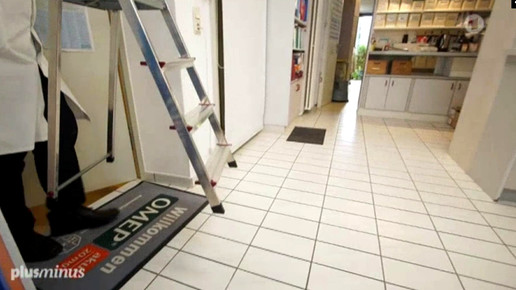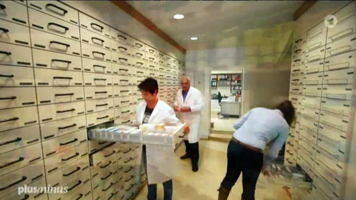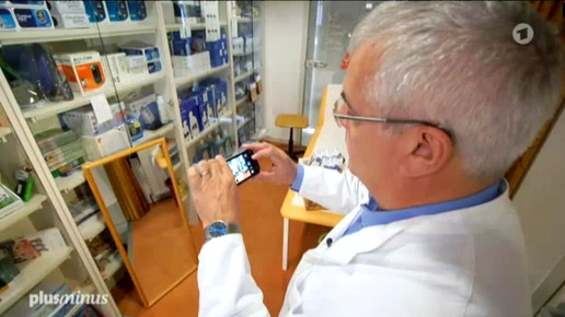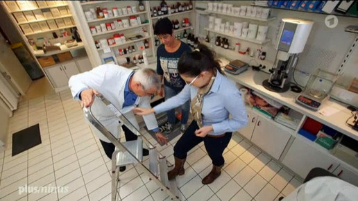 Dann kommt der Apotheker aus Heusweiler mit einer Leiter ins Backoffice, wo bereits zwei Mitarbeiterinnen warten.Screenshot
