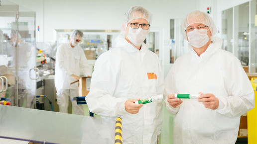 Werksbesichtigung: Heinrich Fleer (links) von Mylan und Bürgermeister Klaus Werner Jablonski (rechts) vor der Tubenabfüllung von Salviagalen Zahncreme.Foto: Mylan Group