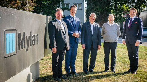 100 Jahre Madaus: Dr. Maximilian von Wülfing, Dr. Oliver Ploss, Klaus-Werner Jablonski, Björn Franken und Dr. Jürgen Mahling (v.l.n.r.) feiern in Troisdorf gemeinsam das Jubiläum.Foto: Mylan Group