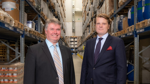 Werksleiter Dr. Jürgen Mahling (links) und Deutschland-Chef von Mylan Dr. Maximilian von Wülfing (rechts) besichtigen das Hochregallager von Madaus.Foto: Mylan Group