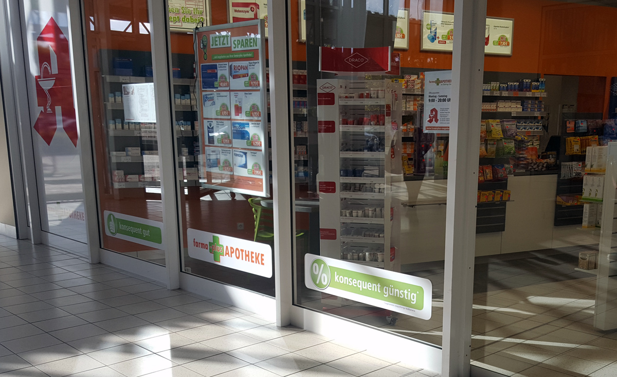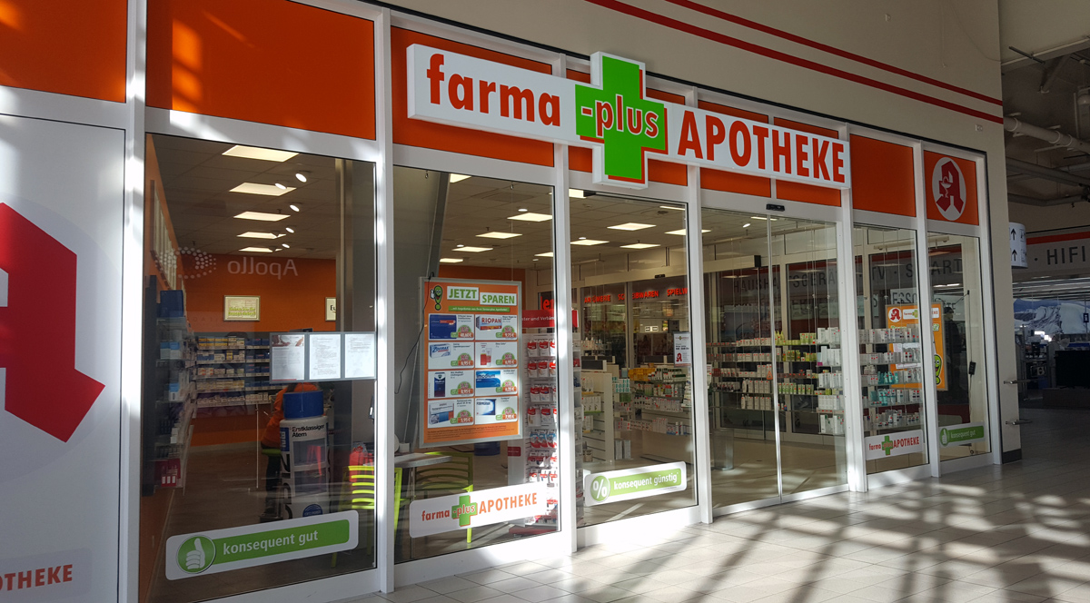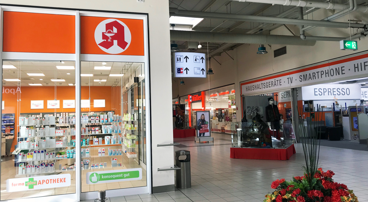 Schräg gegenüber dieser Farma-Plus Apotheke hat eine Müller-Filiale eröffnet. Der Inhaber fürchtet die Drogeriepreise nicht, sondern versteht den neuen Nachbarn als Aufwertung des Standortes.